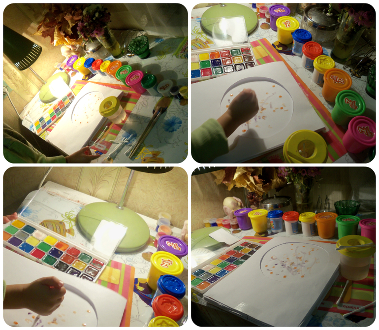 В основном же нужно достать все краски и обязательно расставить их в ровненький ряд. А если добавить еще баночки с пластилином, то вообще красота. И обязательно все пересчитать. Без этого не обходится ни одно рисование.