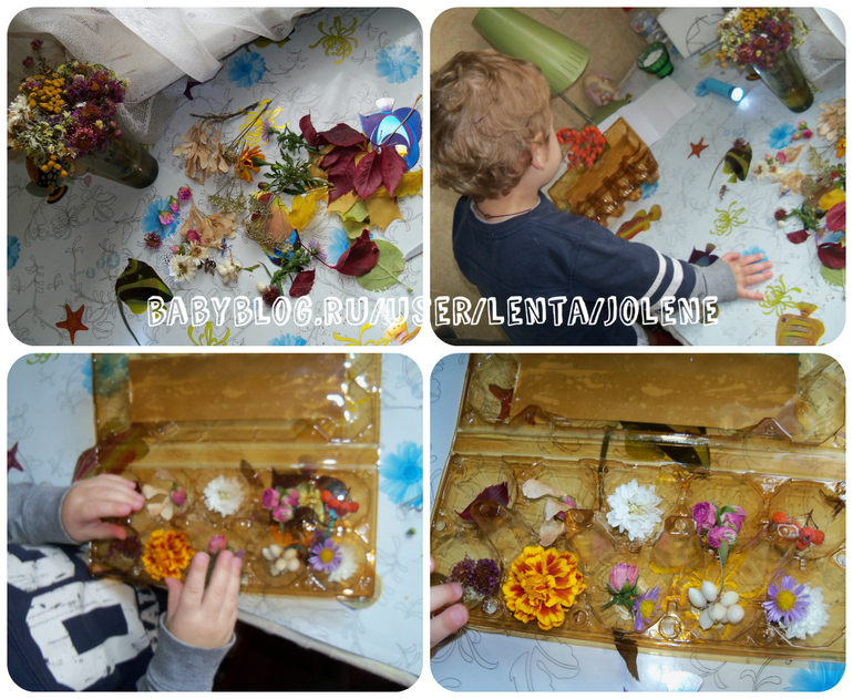 Конечно, насобирали множество природных материалов. Ведро каштанов, например. При этом, Мир не разрешает их никак использовать, только считать и пересыпать в разные емкости.