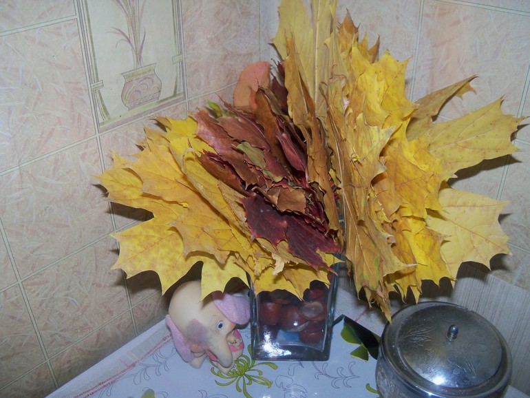 Я букетик из листьев на кухню поставила, но он простоял ровно до того момента, пока ребенок не заметил, что там каштаны и не изъял их.