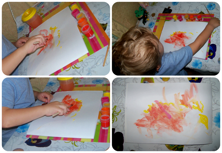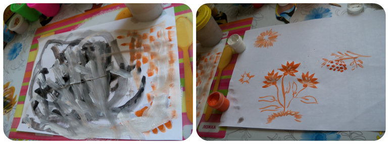 Вот еще наше творчество. Черно-белая картина сына, оранжевая моя. Пыталась его научить ставить кистью отпечатки, потом увлеклась и перебралась на отдельный лист.