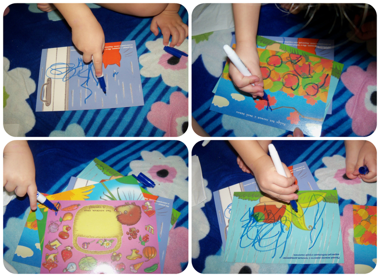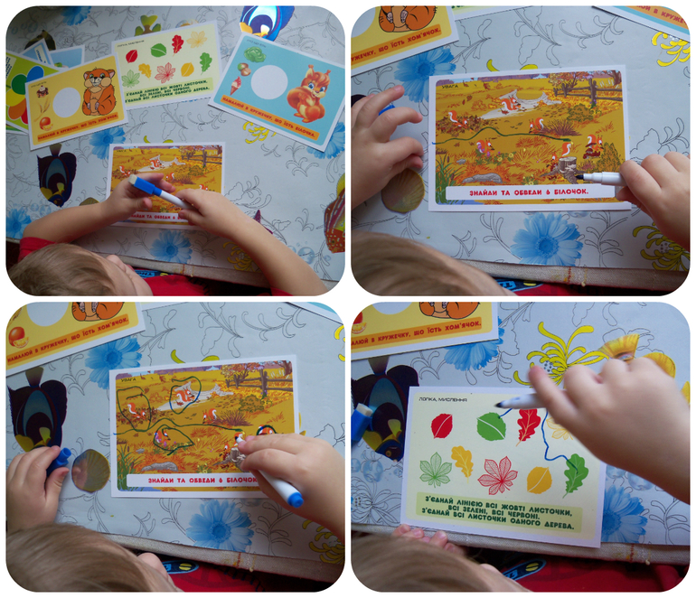 Творческий набор "На этом заборе можно рисовать!" содержит больше заданий на внимание, логику и пр., а не только творческие. Тут мы листики находили, собирали припасы ежику в корзинку. Мир, кстати, научился обводить искомые предметы, теперь все обводит, даже если задание было соединить, например.