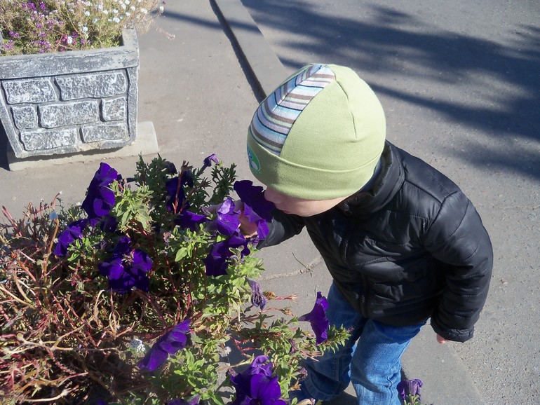 Обязательно нюхает все попадающиеся на пути цветы, а я попутно рассказываю, что скоро их уже не будет и до весны они будут спать.