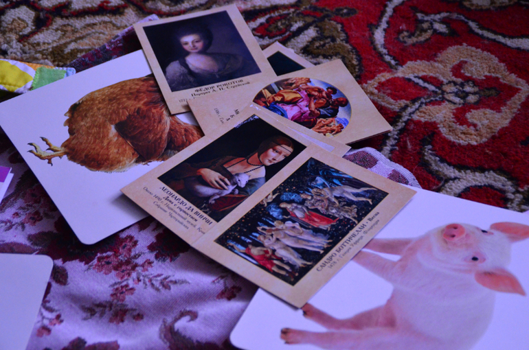 9. Игры с карточками. Ваньке очень нравится рассматривать картинки, особенно те, которые можно озвучить. Так в нашем доме появилась гора различных картинок с животными. Важно, чтобы картинки были не рисованные, а в виде фотографии реальной вещи/животного, для совсем малыша, лучше, чтобы картинки были крупные, ну 20Х20 см минимум, на белом фоне. Потом, Ваня будет постарше, куплю ему резиновых животных, чтобы он так сказать, понял, что они существуют на самом деле. Далее появились карточки с инструментами, звук которых есть в памяти синтезатора. Карточки с игрушками, при этом Ване демонстрируется игрушка, максимально похожая на картиночную. Особый восторг у нас с ним вызывают изображения с репродукциями картин, улыбка во весь рот, объяснить не могу, но ребенок в восторге. А это главное!