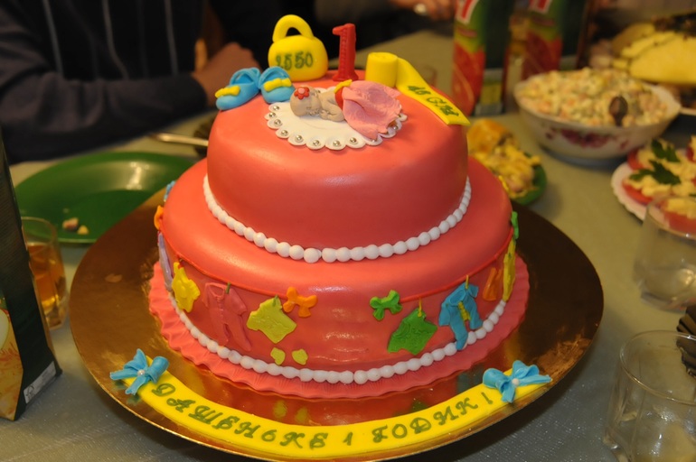 Вот такой получился торт, все никак я не могла определиться, что я хочу, и как он должен выглядеть.... Отметили хорошо, приехал будущий крестный, наши друзья, подарками завалили ребенка, что не знала Даша за что хвататься.