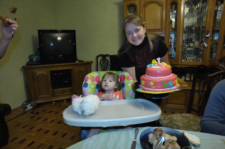Время, время, как же быстро ты летишь! 25 ноября моей младшей доченьке мы отметили годик! Что мы умеем - говорю "алё", подносит руку к уху и говорит-папа, папа, стала делать сама 5 шагов, дальше боится, сама спускается с кровати, попой вниз, любит целоваться и танцевать. 24 поехала в Детский мир, который нахрдится на станции Химки, цены меня просто убили, от 2 тыс и выбрать нечего! Тортик сделала, стол накрыла, устала , что уже было не до отмечания!