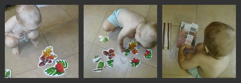 Ветерок дунул и все листочки рассыпались. Боря помогал собрать. Мы сейчас собираем пазл из 7-11 частей. Правда тематика листьев у нас идет плохо. Здесь остановились на 4. Подбирали цвет. Это самое сложное для нас. Я сама с трудом понимаю что куда подходит.