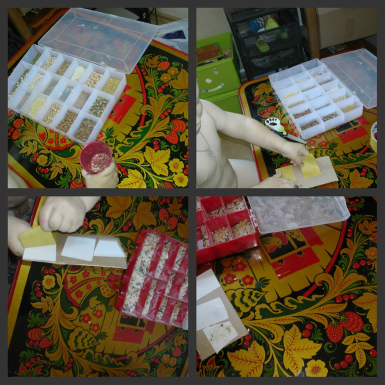 Набирали корм для птичек. На улице отдали голубям. Потом наклеили на картон двусторонний скотч и на него посыпали крупу.