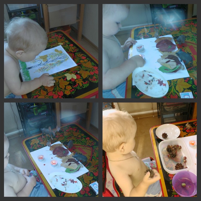 На прогулке послушали как шуршат листики под ногами, сдували с маминой руки листья клена. Увидели на рябине воробьев. Потом расковыряли трухлявый пень и нашли много живностей : дождевого червяка, мокриц, слизней и много других. Положили всех в багажник машины. Нашли желтый листик березы и тоже в машину. Набрали еще скошенной сухой травы.