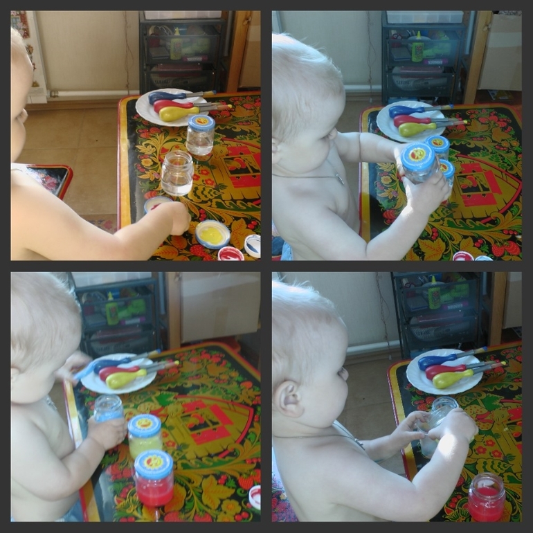 Дома проделали опыт. Намазали краской крышки из под банок. Перемешали. Посмотрели что получилось. Стали смешивать все цвета в отдельной банке.