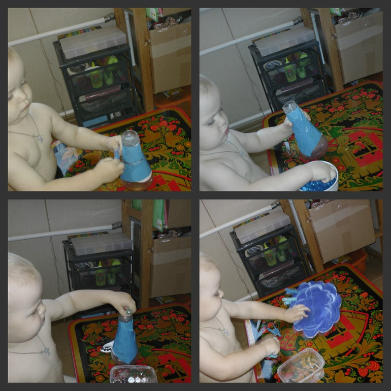Сделали тучку из бутылки. Стали складывать капельки. Сначала гидрогель, а потом стеклянные больше понравились из-за звука.