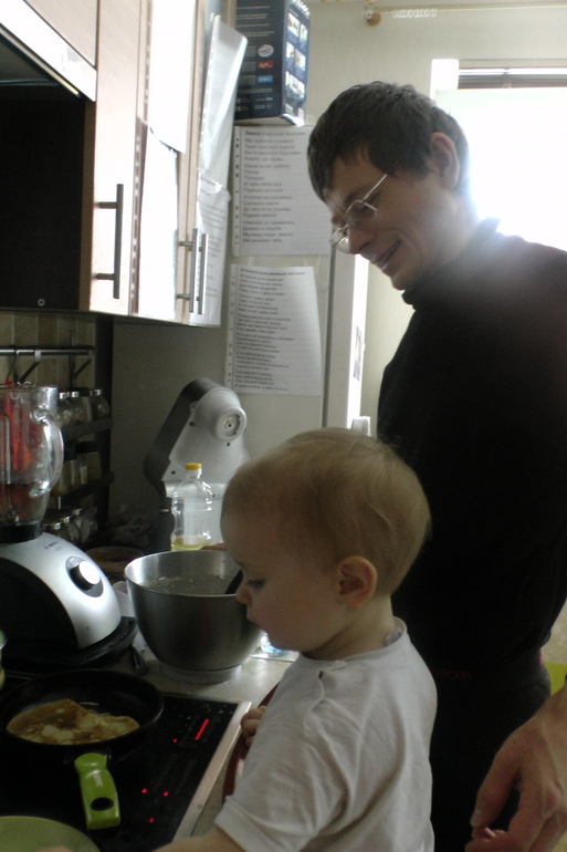 У нас сегодня на завтрак, обед, полдник и ужин Боря готовил блины. После 4 раза, когда Боря замесил тесто для блинов, папа поинтересовался, почему сынок не играет с машинками, жд, а только любит печь блины :)))