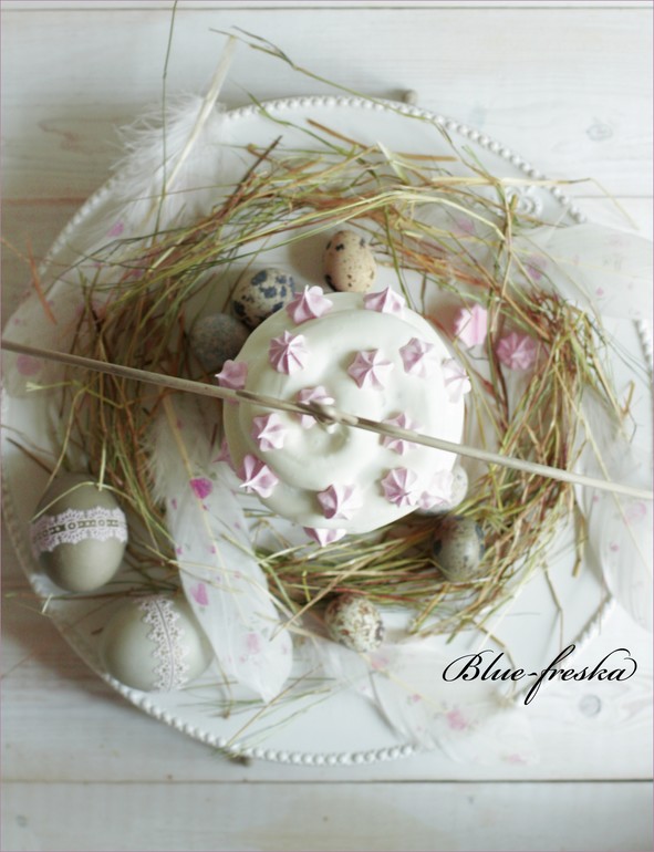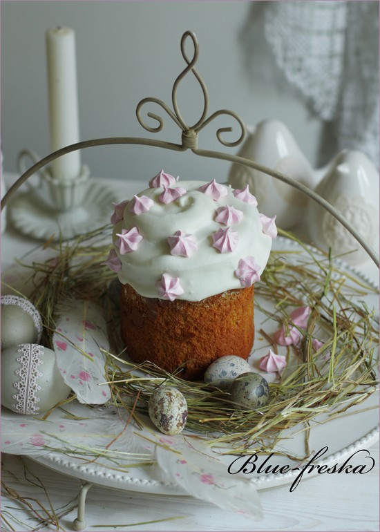 Остывший куличик вынуть из формы и декорировать глазурью(белок взбить с пудрой) и красотой которую сами придумаете:), у меня меренги-малышки, в этот раз, захотелось нежнятины))