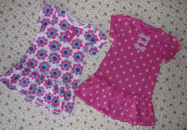 15) Комплект из двух платьев, фирмы Mark&Spenser, размер 9-12 мес, но большемерят. Розовое в горошек - новое, в цветочек постирано, но не ношено.