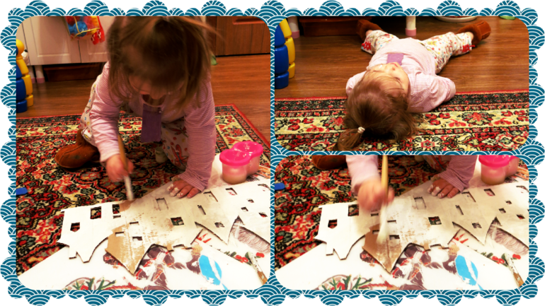 Я ночью вырезала из картона силуэты домов и леса. Мы вместе разукрасили белой гуашью, краски ушол вагон и маленькая тележка, Лина не экономила))))))