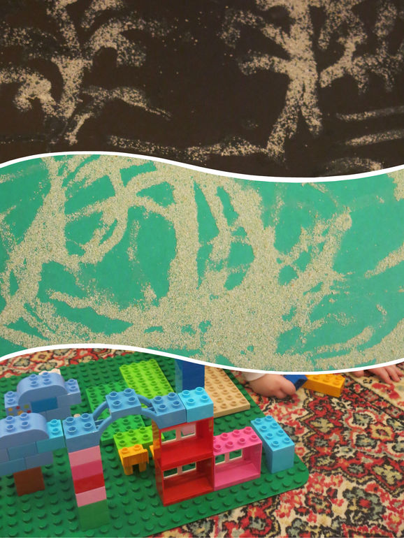 Рисовать красками на отрез отказалась сегодня(,порисовала на манке, далее из нее же выполнили аппликацию в зимнем лесу вечером сделали зимний парк из лего