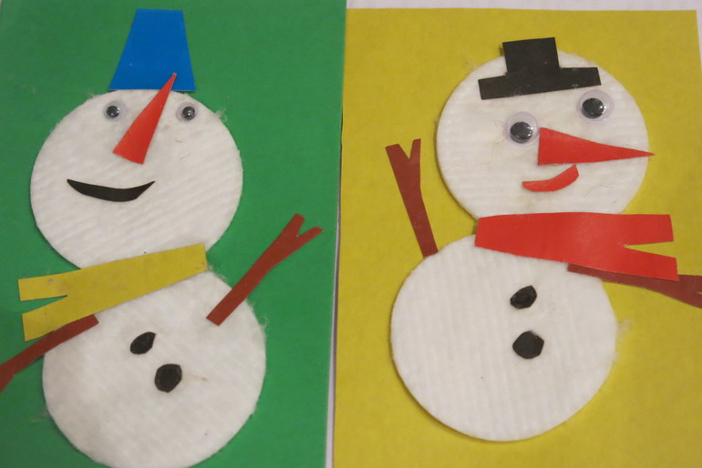 Снеговик. Сделали аппликацию из ватных дисков, я показывала дочке куда клеить шапку нос, в этом бы случае это было бы приклеено даже не на голове))))) С фигуркой снеговика она справилась сама.