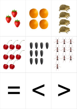 Здесь все просто, разрезаем на карточки, предлагаем сравнить количество.