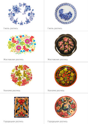 Рассматриваем узоры, знакомимся с различной росписью, находим пары (картинки, конечно, предварительно следует разрезать).