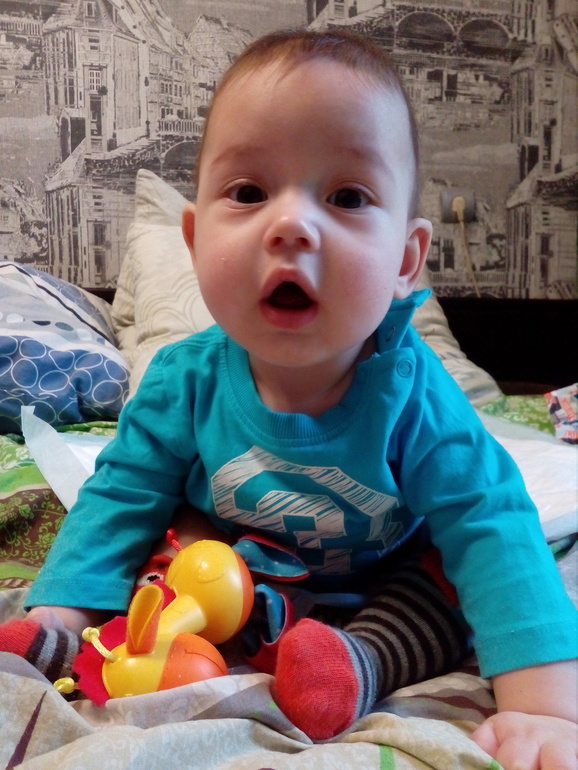 С 7 месяцев и 20 дней стал целоваться ,цел ует нас всех ,всех слюнявит 😘😂 наш малыш, ходили к 2м педиатрам и везде намерили рост разный, одна намерила 74 см а другая 71 сама померила где то 73с небольшим получилось вес 8.500 .кушаем много чего , все фр...