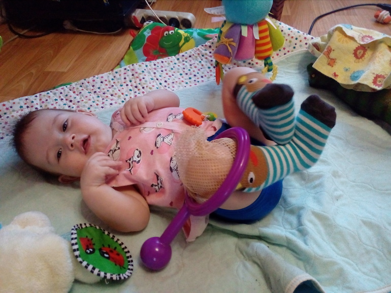 Вчера сказала мама но больше не повторял. Ползаем как гусеница ,попку поднимаем и в вперёд. В свои игрушки вообще перестал играть ,хорошо что Полина делится своими. Играют вместе в домик и в мячик .