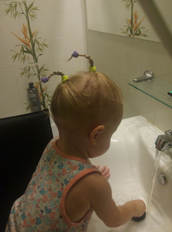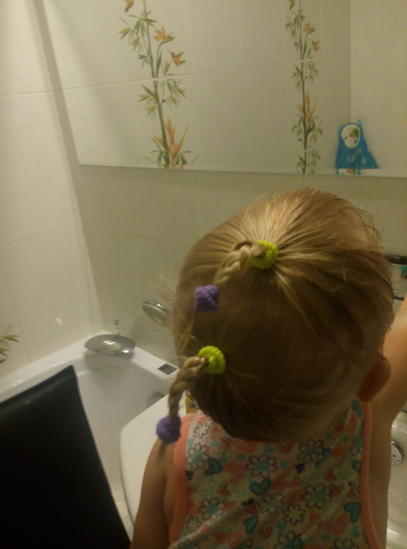 теперь днём спит только на улице ,дома аж до трясучки не в какую не ложится ,только в кроватку или к себе на диван и сраз плач . А на улице уже через 5 минут спит ! Что то прям боится она ...толи сон плохой приснился толи ещё какой нибудь страх )))вчера в ванной играя в игрушки произнесла 2 раза подряд ,,оин,,(один) вроде бы начинает потихоньку что то говорить а то кроме мама,папа ,ам-ам ,ба-ба ,не чего не говорила ,только на своём! Не как в садик не сходим , затянулся процесс с сменой документов !!! Это наша прическа и с гулянья фотка