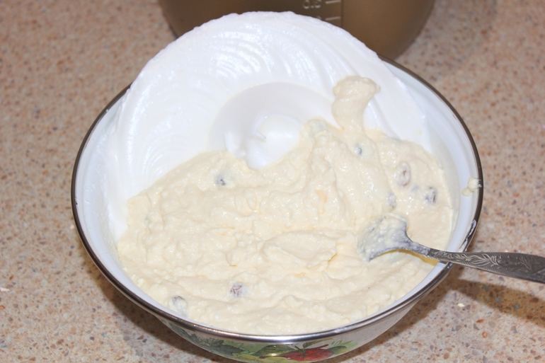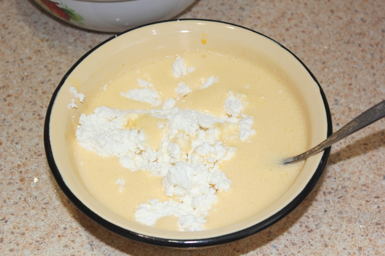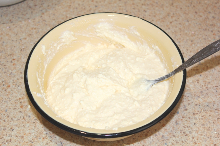 Затем добавить творог (если творожные зерна слишком крупные, творог можно протереть через металлическое сито)