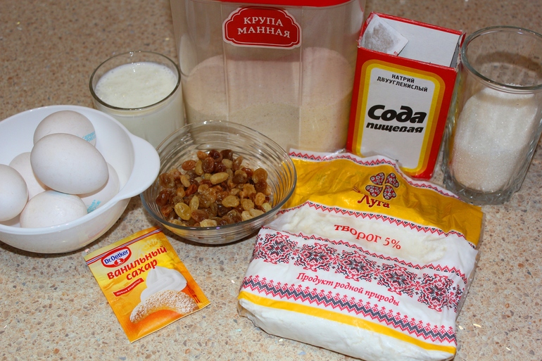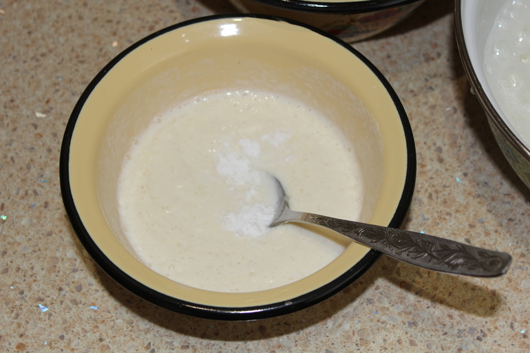 В миску с кефиром добавить соду, манную крупу. Манка должна набухнуть в кефире 15-20 мин.