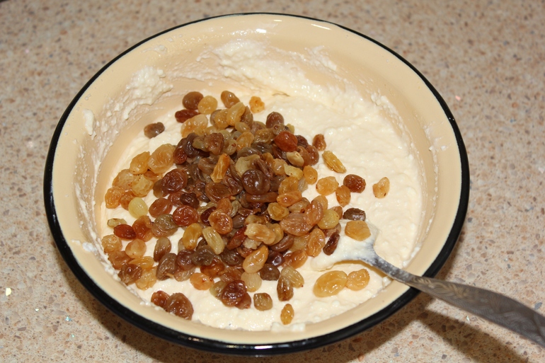 Изюм замочить в воде на несколько часов, хорошо промыть