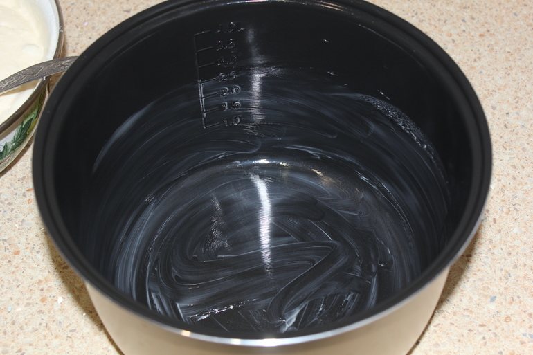 Чашу мультиварки смазать сливочным маслом, выложить в неё творожное тесто. Выпекать согласно инструкции к мультиварке.