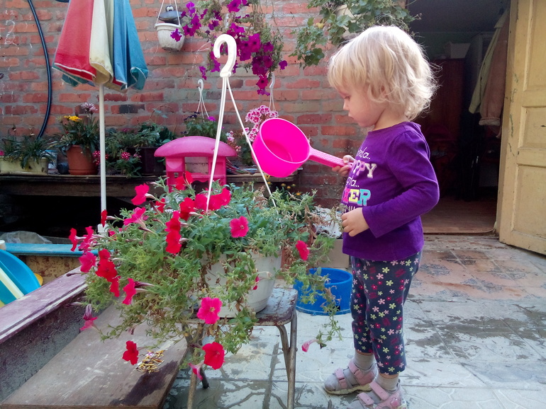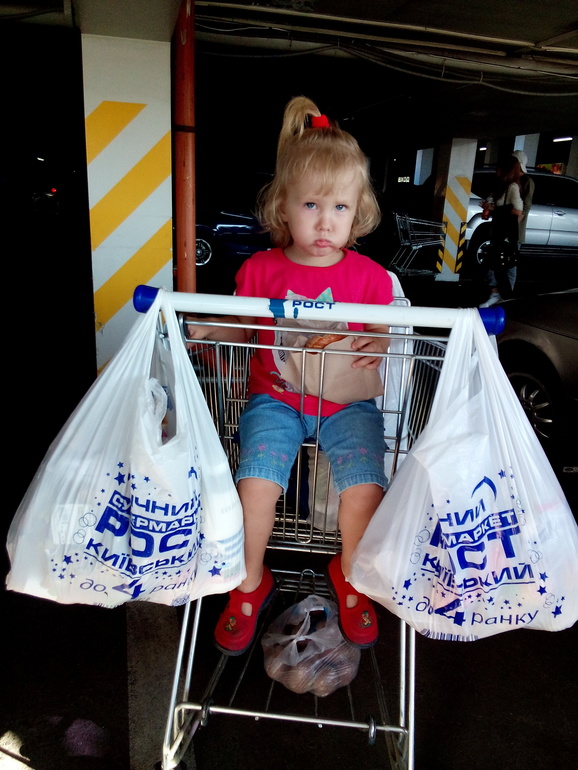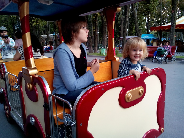 Особых прорывов в развитии у Евгеши нет, с горшком все нестабильно- то просится, то дудонит в штаны, видимо по настроению. Речь медленно развивается, пытается нам сказки уже сочинять и рассказывать : Бу теп-теп-теп, ам и фсе!))) . Перевожу - пришла корова, съела кукурузу ( показывает при этом на картинку) и все. При этом очень выразительно жестикулирует и корчит морды! Из слов добавилось - дизись ( держись), бощ ( борщ) , сези ( звезды) и много другого мало разборчивого для посторонних лепета. Очень любит слово "фсе":поест- "я фсе!", пописяет на горшок - "я фсе"... В фаворе по-прежнему качели, из мультов Свинка Пепа, и в последние дни пластилин. Вредничает много, пытается истерить. Дневной сон не налажен, то спит, то не спит. С едой такая же фигня - сегодня это ест, а завтра плюется . Любит сметану - вчера ела гречку с котлетой, политые сметаной - извращенка!