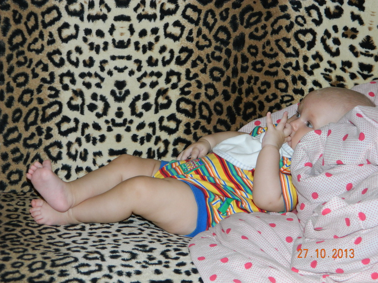 Читаю посты мамочек- детки ровесники уже вовсю переворачиваются, игрушки держат , а Женьке лень ! Игрухи хватает только подвешенные на дуге шезлонга или стульчика и упорно тянет в рот, а те,что я ей протягиваю может конечно взять,но сразу бросает . На животе ненавидит лежать с рождения, если поймать настрой,то может пролежать минут 5-10 при условии ,что перед ней будут игрушки и мама ))),но ,если она не в духе, то все - кладет голову и орет ! Я ее обманываю-катаю на фитболе на животе ))) Зато сидеть очень хочет. Из положения полулежа садится на несколько секунд и валится набок. За мамины пальцы держась, садится и сидит достаточно долго,разглядывая все вокруг. Но вот перевороты,точнее их отсутствие, меня расстраивают, действительно,зачем Женьку переворачиваться на живот,если она эту позу ненавидит ?!