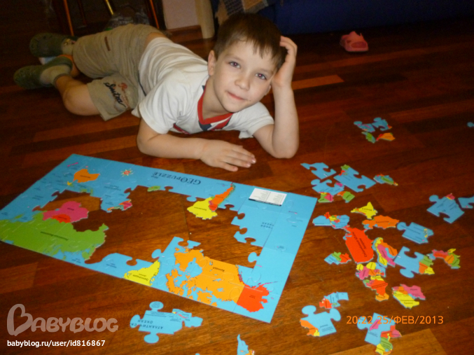 очень любит собирать ГЕОпазлы,тут каждый пазл - страна,очень познавательно,поначалу и мне было сложно собрать,особенно мелкую Европу