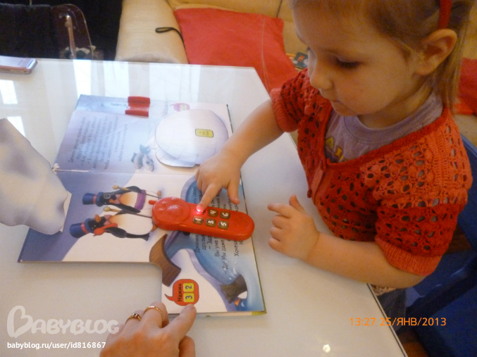 О, а эта наша любимая ,на этот день,книжка с телефоном,по которому звоним животным из зоопарка, а они отвечают нам.Причем Марина почти сразу запомнила цифры,сама мне говорит: "нажми три и два", а вот с Женей намучилась,лет до 5 ,наверное,уже точно не помню,и телефон этот ему не помог совсем,долго путал цифры от 5 до 10 .