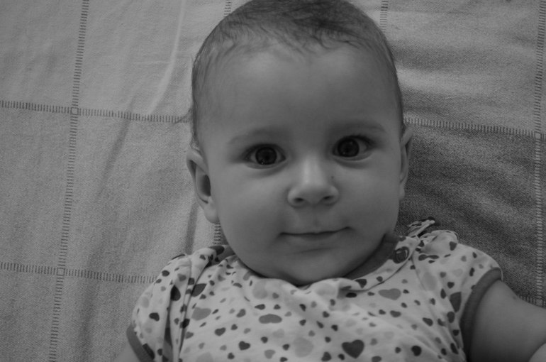 Улыбчивая и стеснительная уже, дедушка говорил какая она красивая, а она засмущалась, заулыбалась и уткнулась мне в шею.