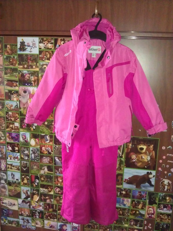 Можно носить начиная со 110 за счет манжет ,они утягиваются и до 116,Утеплитель 150гр.этот костюм считается горнолыжным,можно носить до 0 градусов ,смотря что пододеть под куртку).Куртка в идеале, штаны на одной паре во внутри по манжету чуть вытерлось ,не получается сфотографировать.Продаю только комплектом.