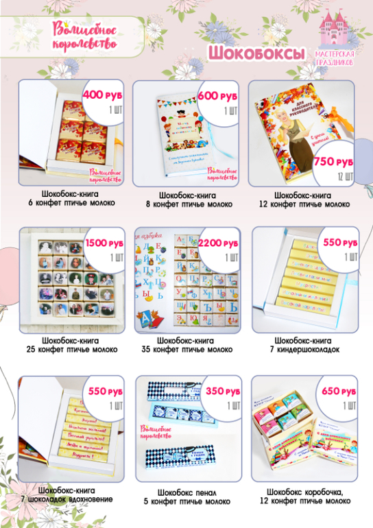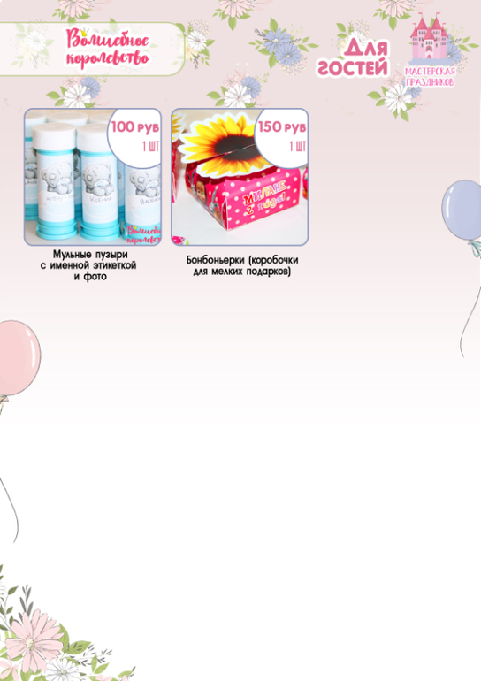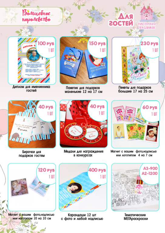 - подарки гостям (магниты, шоколадки, мыльные пузыри, пазлы, календари, кружки, тетради, блокноты, брелоки)