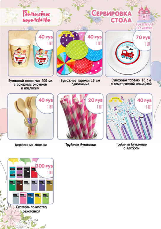 - сервировка стола (тарелки, стаканчики, скатерти, фатиновые скатерки- юбки, салфетки, трубочки)