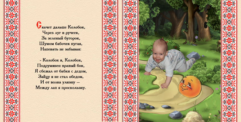На каждом развороте фото ребенка встраиваются в дизайн полноцветных сказочных фотоиллюстраций и размещается на обложке.