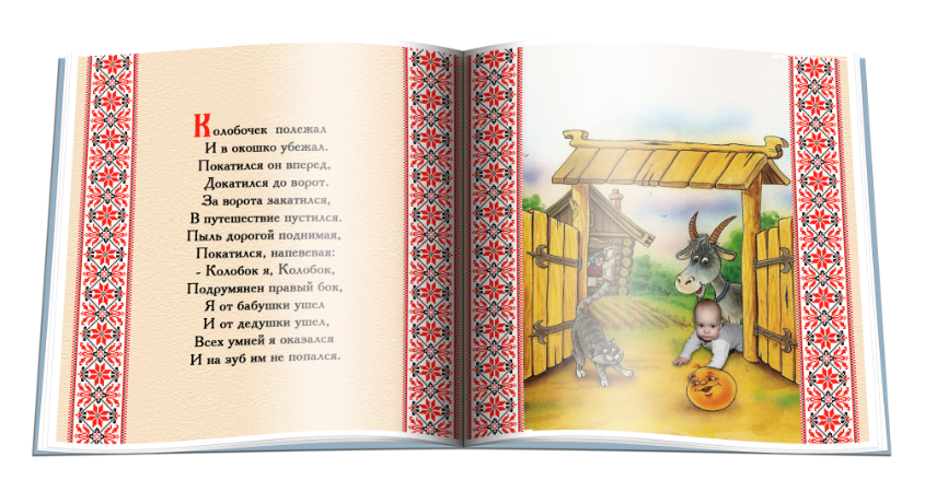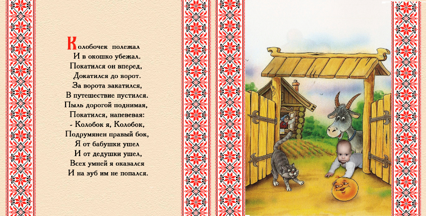 Вот пример нескольких разворотов сказки про колобка. Текст стихотворный.