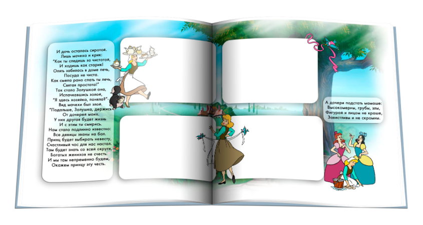 Именно в этой Фотосказке золушка вставляю фото малышки, без участия. Но есть много вариантов и с участием малыша. Цена фотосказки 300 руб за 1 разворот, от 10 до 40 разворотов.