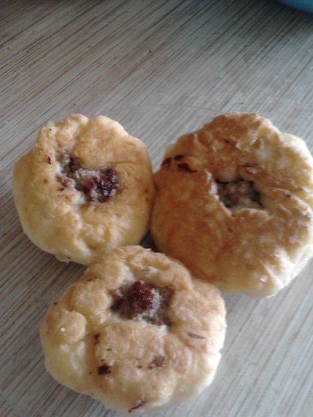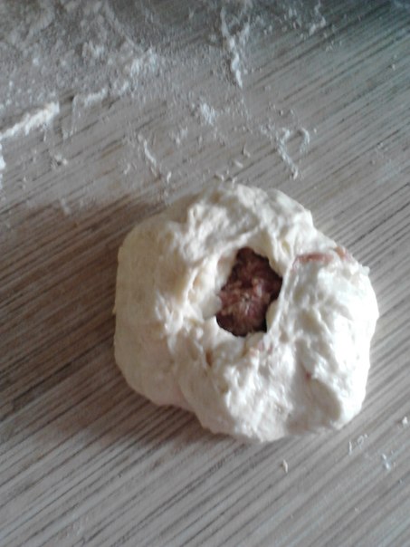 тесто разделила на шарики,каждый шарик "расскатала" руками. На серединку лепешечки положила фарш,пришипнула по краям таким образом чтобы осталась дырочка.
