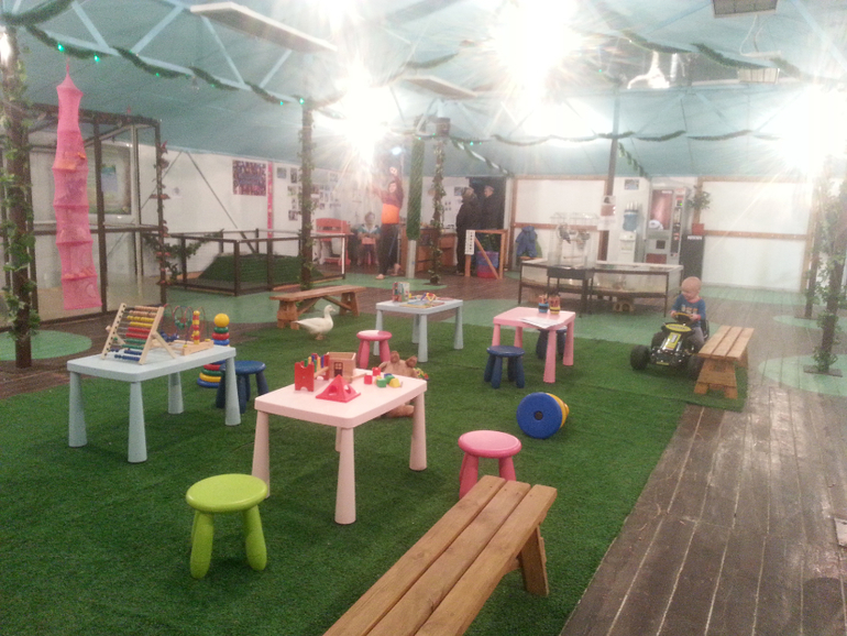 Загончики с животными расположены вдоль стен помещения, а в центре разместили детскую игровую зону - там есть пирамидки, машинки, паровозики, развивающие игрушки, книжки, раскраски и т.д. Но ключевым предметом для Славика там стал велосипед, сделанный в виде гоночной машины! Отойдя от утки, он тут же бросился к этому велосипеду, и половину времени нашего пребывания в зоопарке просидел в нем)) Мальчишки...