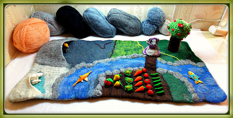 Девочки, решила научиться мокрому валянию) Сначала сваляла чехол для телефона (ниже покажу). А потом решила сделать то, о чем давно мечтала))) И вот то, что у меня получилось). Коврик из латвийского кардочеса. Овощи из какой-то детской массы для лепки. Мышка связана крючком и спицами)