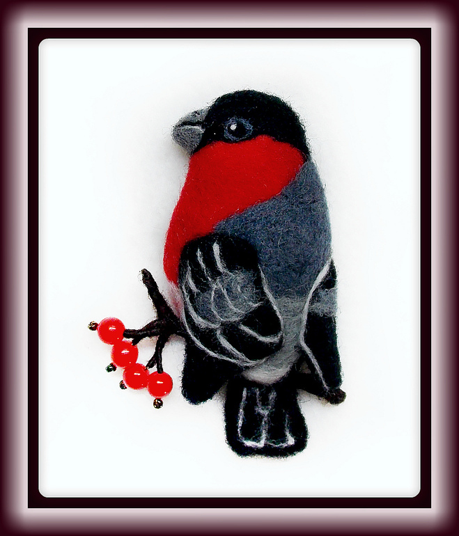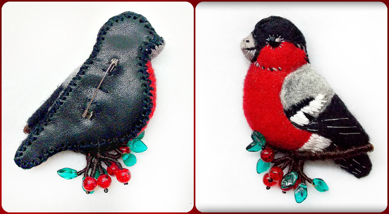 В подарок одной Бэбэшечке сделала вот такую брошь) Снегири с рукавичек переместились и на другие мои изделия)))
