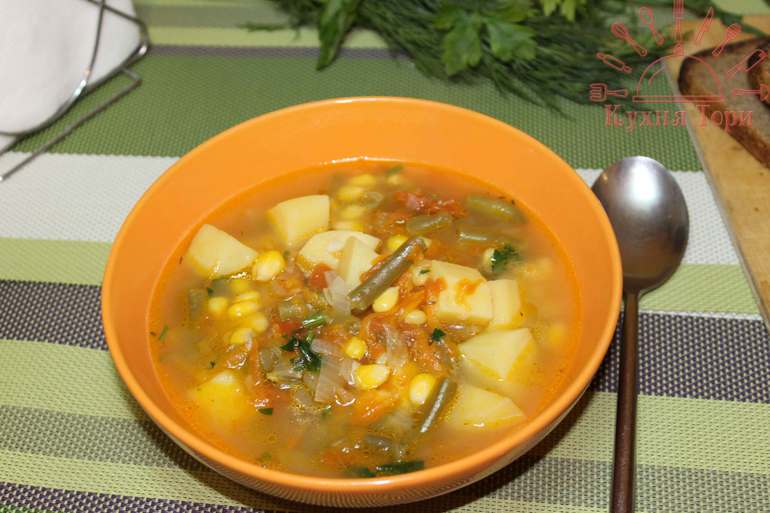 Добавляем в суп фасоль и кукурузу, и варим на среднем огне до полной готовности картофеля.