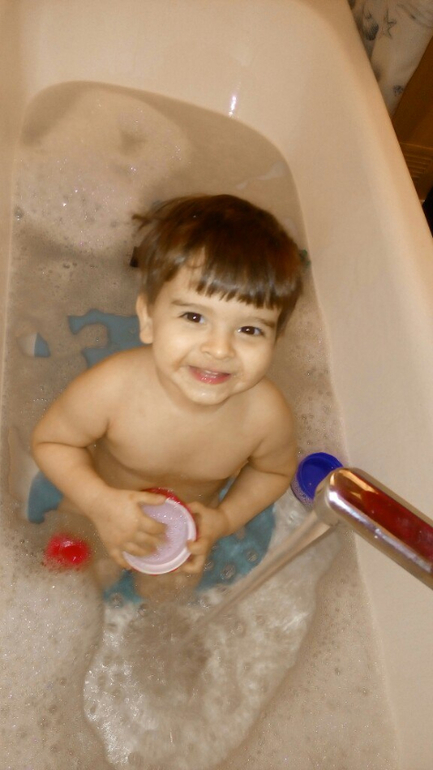 Очень любит купаться. Ребенок отказывается до истерики одеваться и раздеваться сам (максимум, чему смогла научить - одевает и снимает трусы, снимает штаны, носки, колготки, шапку, обувает валенки. Но, если набирается ванна, он за минуту раздевается САМ. А потом берет одежду и кладет в тазик с грязным бельем. В такие моменты я понимаю, что где-то сын меня разводит и все он умеет...