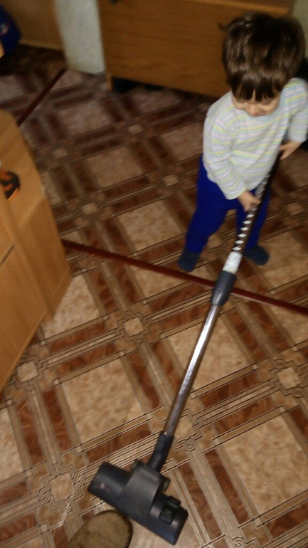 Часто играем вместе, но может и один посидеть поиграть. Иногда специально уходит на кухню, садится на диванчик и по столу катает машинки. Мне заходить на кухню запрещает.