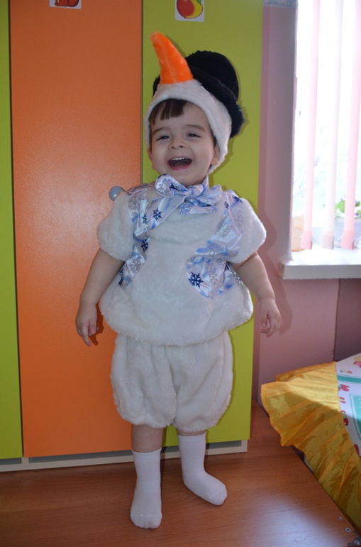 А это веселый снеговик на утренник ходил :) Костюм сама не покупала, были в детском садике. На утреннике дали подарок, из-за которого мы еле оделись. Просто не хотел выпускать его из рук. Домой подарок нес сам.