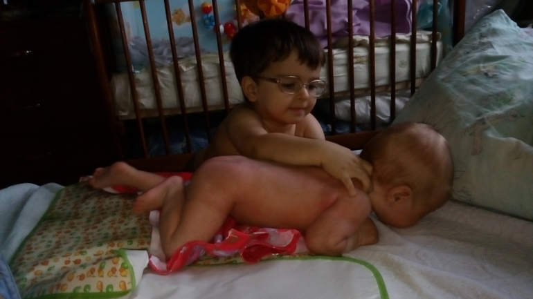 Все так же приносит игрушки, показывает ей погремушки, любит и часто просит подержать на ручках. Разговаривает с ней (и-а (алиса) агуу - агууу). Пальчиковые гимнастики на ее руках показывает. Что-то ей вечно рассказывает (то про игрушки, то про собаку, то про что-то, что вокруг происходит), бывает и жалуется ей на маму. Первый бежит к ней, когда слышит, что алиса проснулась или плачет. Как-то смотрели кино, где лялька заплакала, так сын подскочил и побежал сестру проверять. Еще нравится ему подойти к Алисе, раскрыть ей ручку и помахать ее ручкой «пока», а сам в это время пригибается или прячется за что-то и говорит «мама пока» (как будто это не он, а Алиса).