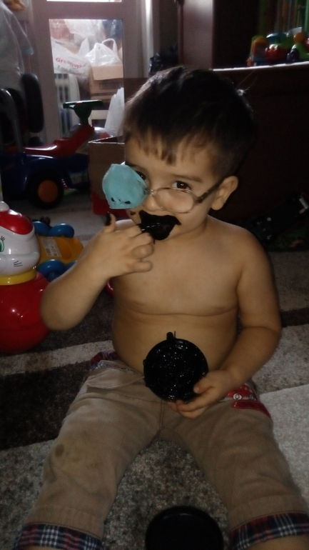 Это красивое гуталиновое чудо. Нет, он его не ел, он им губки мазал. При моем появлении мазать начал раза в три быстрее. (отмывая с ребенка крем для обуви я поняла суть поговорки «как с гуся вода», водоотталкивающие свойства этого крема просто шикарны!) На вопрос, «как он достал крем для обуви», отвечу сразу… залез на шкаф и палкой от каталки сбил крем с верхней полки!